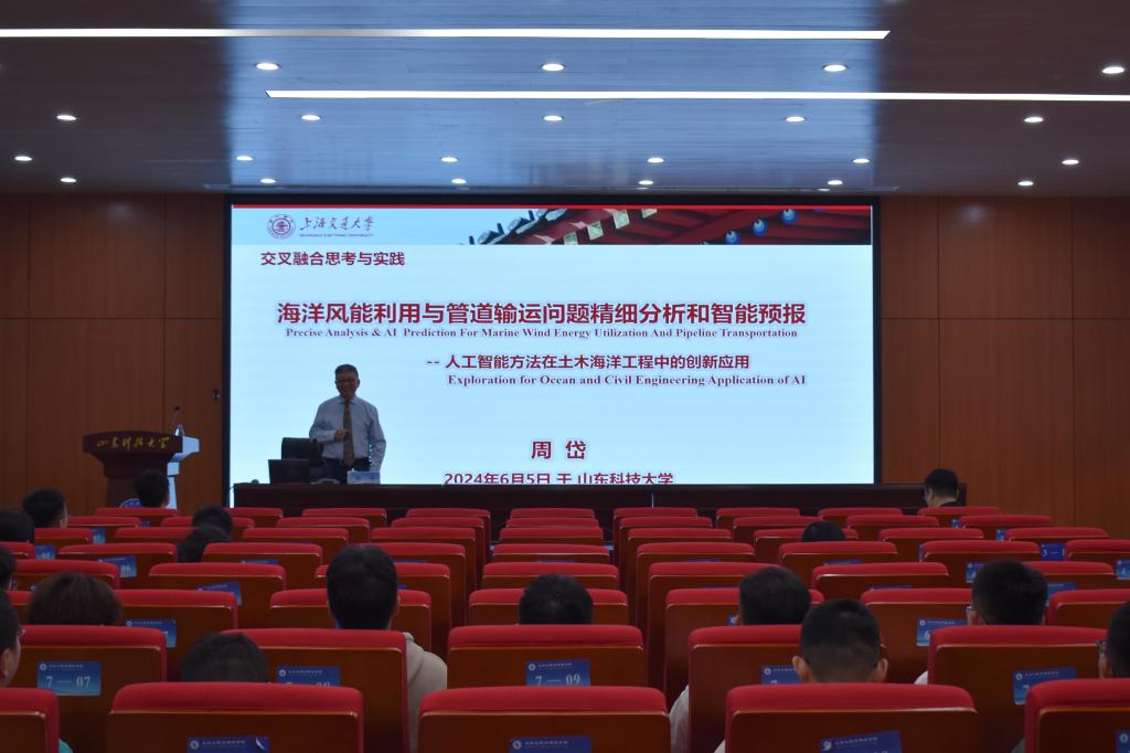 周岱教授在报告之前首先回顾了他在山东矿业学院学习的经历,对母校和恩师的栽培表示感谢。随后,他便开始介绍关于海洋风能利用与管道输运问题精细分析和智能预报的报告,主要围绕土木工程与AI技术的学科交叉展开。先是对海上风场以及风工程中的深度学习等背景进行介绍,再引出数据修复这一关键步骤,周岱提出利用自监督学习(线性映射嵌入、注意力机制)来对海上风速数据处理。紧接着,他从实际情况出发,对海上大型H轴垂直风力机的结构进行改进优化。此外,他还提出海洋采矿矿物运输的新机制。最后强调要将土木的学科知识与其他学科进行交叉,不断革新,才可使土木之树长青。