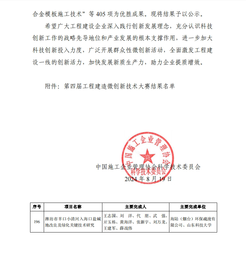 近日,中国施工企业管理协会公布了“第四届工程建造微创新技术大赛”结果。由威廉希尔官网作为第二完成单位,代朋副教授作为第三完成人、亓玉栋副教授作为第五完成人的参赛技术成果“潍坊市羊口小清河入海口盐碱地改良及绿化关键技术研究”荣获二等奖。