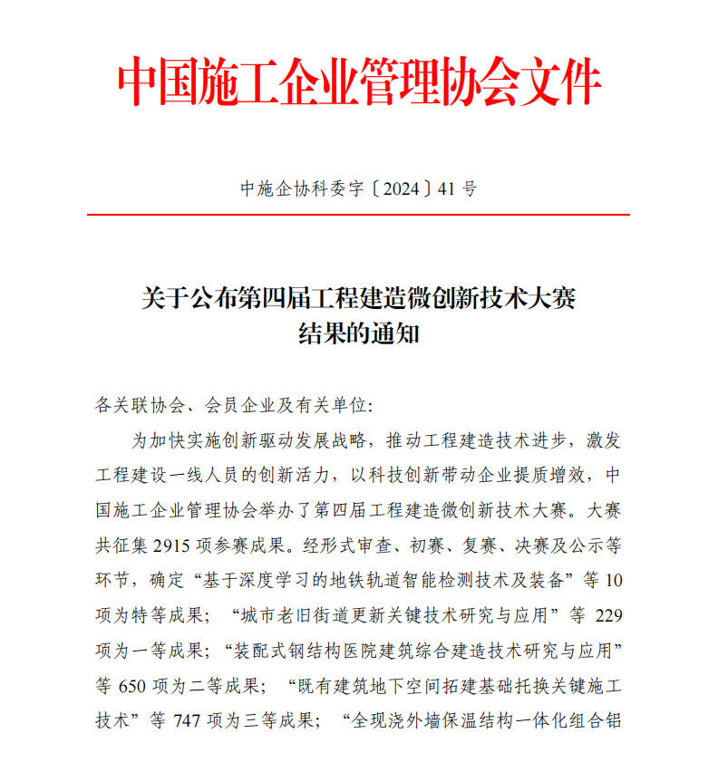 工程建造微创新技术大赛由中国施工企业管理协会主办,已举办四届。旨在加快实施创新驱动发展战略,推动工程建造技术进步,激发工程建设一线人员的创新活力,以科技创新带动企业提质增效。本次大赛征集成果经形式审查、初赛、复赛、决赛及社会公众投票等环节,最终评出特等奖、一、二、三等奖和优胜奖。