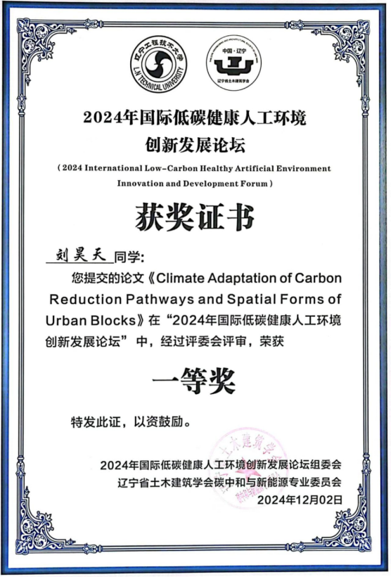 williamhill英国威廉希尔代朋教授和硕士研究生刘昊天应邀参会,刘昊天同学做了题为《Climate Adaptation of Carbon Reduction Pathways and Spatial Forms of Urban Blocks》的专题报告,同步提交的论文被大会评委会评为一等奖。