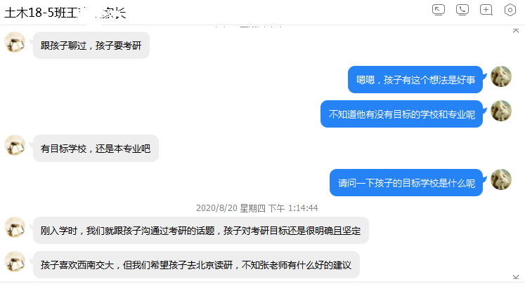 8月份,williamhill英国威廉希尔学生工作办公室各辅导员通过线上家长会、家长群、电话家访、微信一对一沟通等方式,根据学生具体情况和所处年级和时期,沟通了解学生在家期间的学习生活情况和生活动态,反馈学生在校期间表现,询问家长对学生的培养理念和期望,并给予建议。辅导员鲍娜娜在城乡规划和建筑学专业线上家长会上,向家长们介绍了2015级毕业班的就业与考研情况,并针对考研录取率背后折射出的原因和问题提醒家长们要根据学生实际学习状况规划合理目标、做出最佳选择。