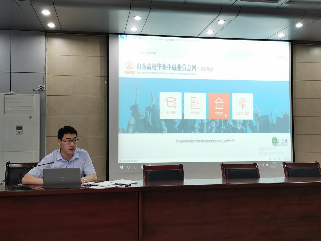 毕业生辅导员王贝贝介绍了当前毕业生就业情况,并针对山东高校毕业生就业信息网,对学生签约类型、签约流程、可能遇到的问题及其解决方式进行演示和讲解。