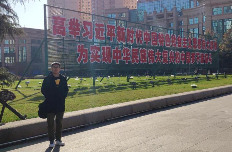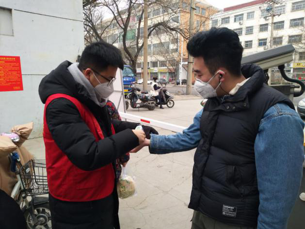 在山东省滨州市滨城区市中街道市南社区,williamhill英国威廉希尔2018级研究生周臣像往常一样在社区服务岗进行志愿服务,使用红外线体温测量计为进入社区的居民测量体温便是他的工作之一。