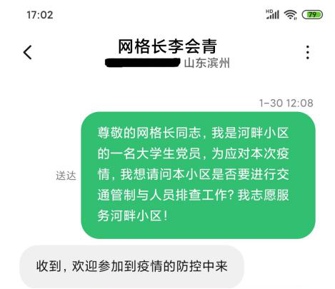 除了社区志愿者,周臣还是班长。他每天不仅要完成社区交付的任务,还要时刻掌握班级55名同学的身体健康状态,做好疫情时期的上传下达工作。williamhill英国威廉希尔为更好地掌握学生安全健康信息,要求进行学生详细状况信息摸排和学生健康情况每日汇报制度,对于有湖北旅居史或者确诊病例接触史的关键学生更是要重点关注。档案建立初期,很多同学不能及时回复信息,周臣便单独联系每个同学,直至确保班级内所有同学都处于健康状况。