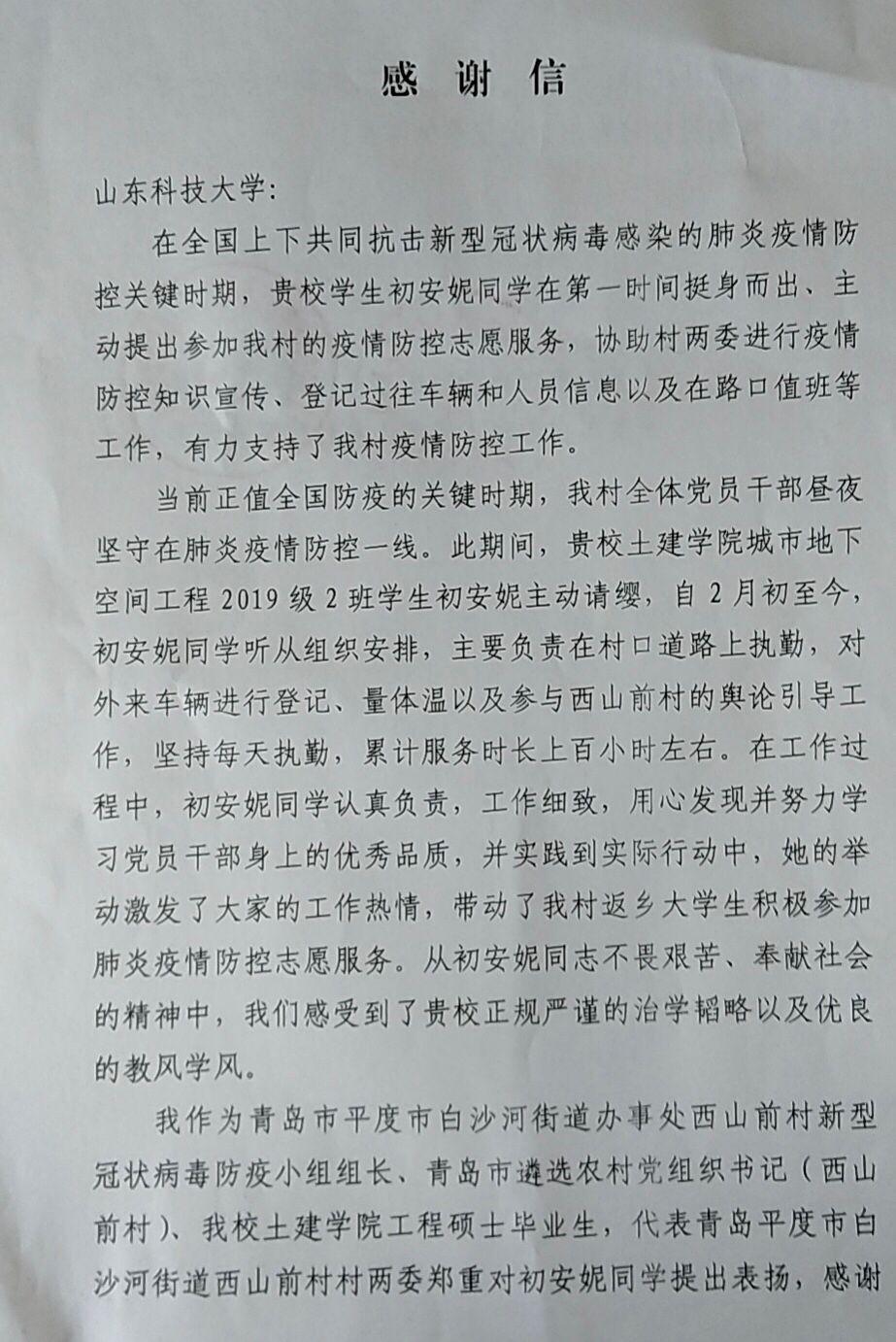 近日,williamhill英国威廉希尔收到中共平度市白沙河街道西山前村支部委员会的感谢信,了解到在全国上下共同抗击新冠肺炎疫情的时候,威廉希尔官网城市地下空间工程2019级2班学生初安妮也主动站到了抗“疫”前线,在青岛平度市白沙河街道办事处西山前村提供疫情防控志愿服务。