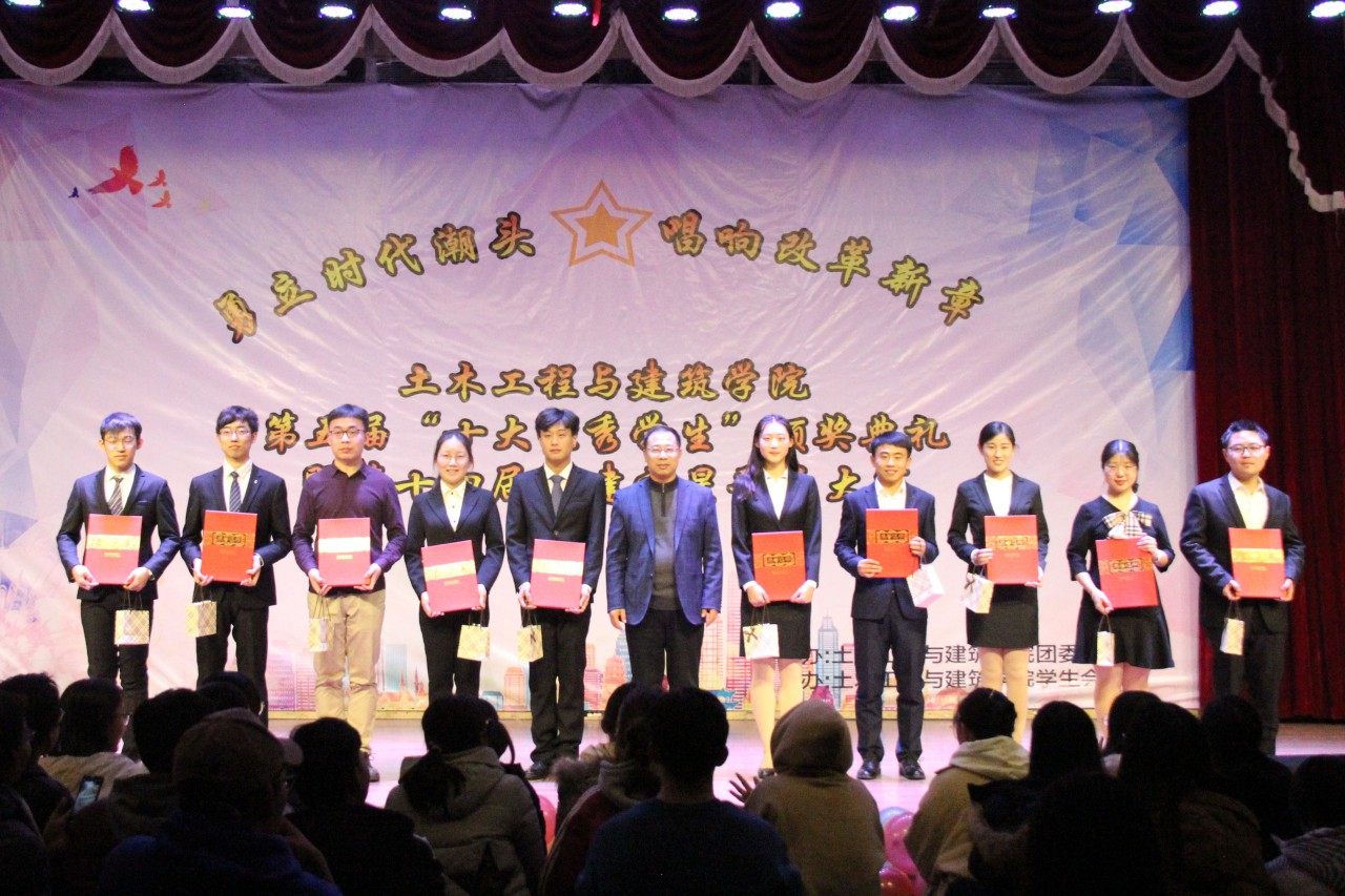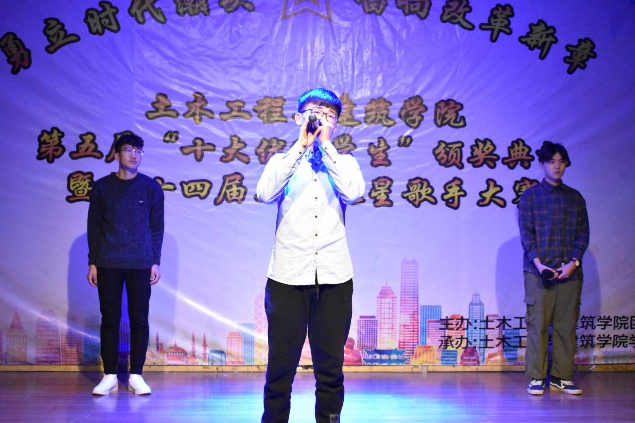 12月12日晚,williamhill英国威廉希尔在大学生活动中心成功举办第五届“十大优秀学生”颁奖典礼暨第十四届“勇立时代潮头,唱响改革新章”土建之星歌手大赛。到场的嘉宾有williamhill英国威廉希尔乔卫国院长、郝亮副书记、王崇革副院长、党政办郝兆青主任、团委于娜书记及团委所有专兼职辅导员。担任本次活动的评委有校大学生艺术团副团长闫肖帆、williamhill英国威廉希尔学生会主席陈子璇、校大学生艺术团声乐队副队长陈登阳、校大学生会素质拓展部主席王轶涵、校学生会素质拓展部副部长孙钰鹏、校第十四届校园歌手大赛冠军王博学、校N.O.B街舞协会会长孙小翔。