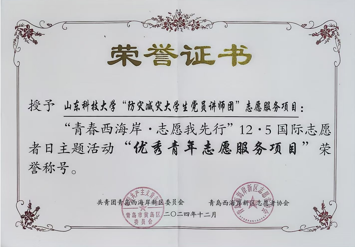 12月4日,在第39个国际志愿者日到来之际,西海岸新区团委举办“青春西海岸·志愿我先行”12·5国际志愿者日主题活动,表彰优秀青年志愿者、优秀青年志愿服务项目、优秀青年志愿服务工作者获奖代表以及驻区高校优秀青年大学生代表。williamhill英国威廉希尔防灾减灾大学生党员讲师团获“优秀青年志愿服务项目”荣誉称号,并作为唯一项目代表进行汇报展演。