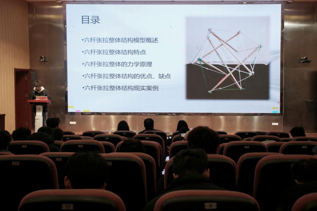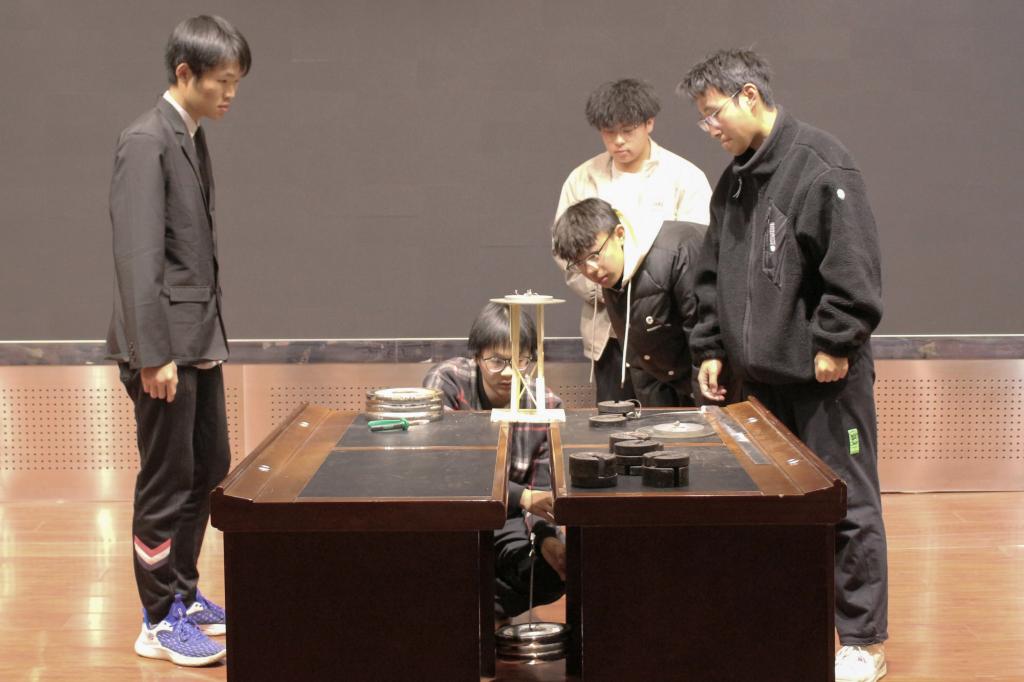 B组比赛以棱台为设计基础,共有六支队伍进入决赛。选手们介绍各自棱台模型的设计创意与构思,随后工作人员对每组的模型关键承重部位进行静荷载和冲击荷载并得出成绩。随后邓芃、孙黄胜对选手们的模型设计进行点评,他们表扬选手们敢于创新的精神,同时指出选手们设计结构存在的部分问题并提供改进思路,并结合自身的生活经历提出自己对结构设计的见解,最后向各位学生发出学好基础知识、培养专业兴趣、勇于创新实践的倡议。