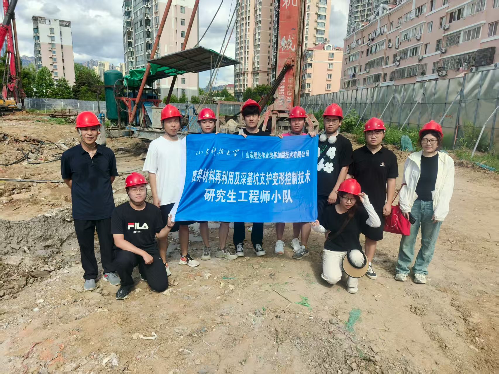 “废弃材料再利用及深基坑支护变形控制技术”工程师小队的九名研究生,于暑期奔赴青岛市黄岛开发区五台山路中海工程部开展了为期十五天的实践活动。在实践中,小队成员系统学习了深基坑施工的工艺流程、安全控制要点及注浆加固技术的原理与操作要求。通过与工程技术人员的交流,加深了对专业理论知识的理解,显著提升了分析和解决实际工程问题的能力。此次实践活动为队员们在今后的科研和工程应用领域的深入发展奠定了坚实基础。