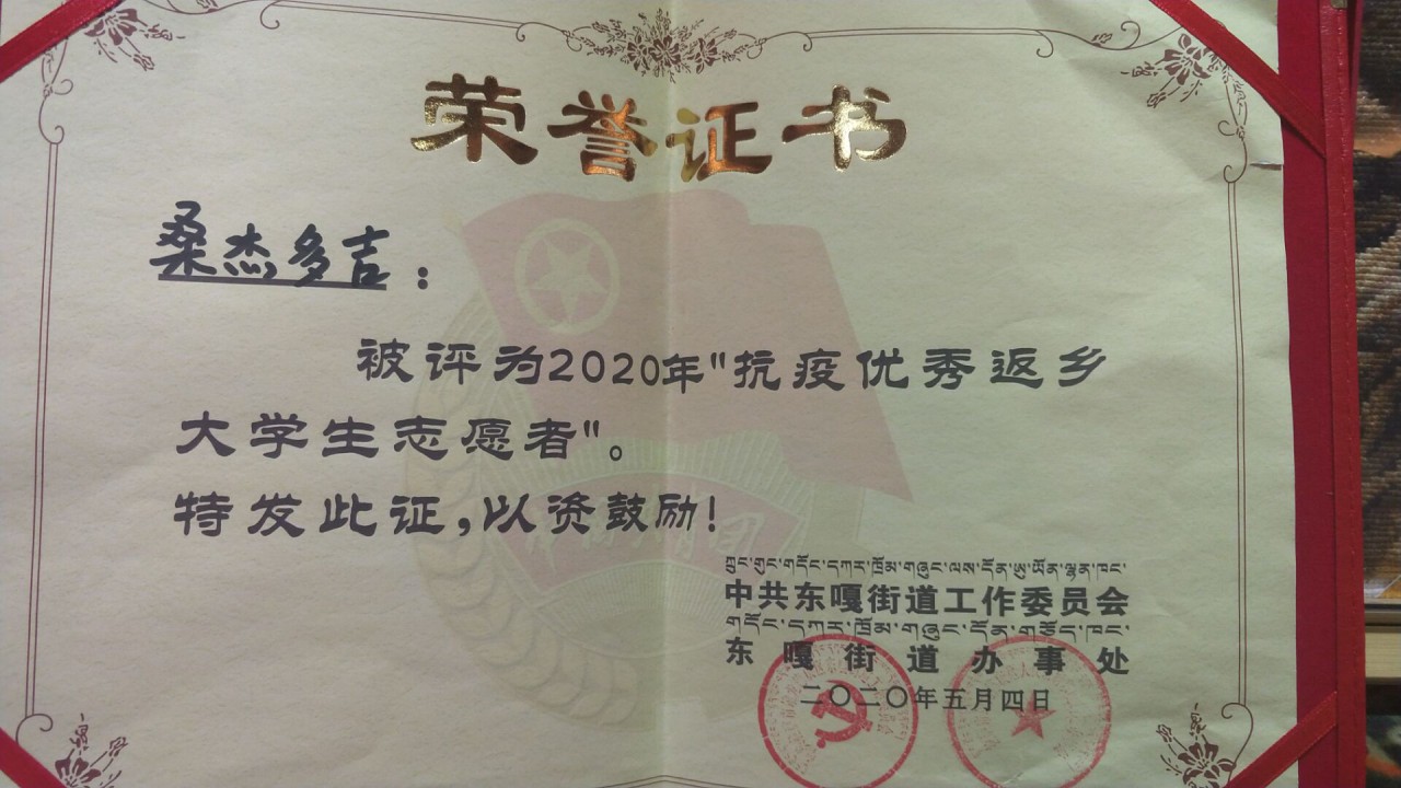 桑杰多吉,西藏拉萨人,土木工程18-6班学生,现任williamhill官方网站Beat Box社团社长。疫情期间,桑杰多吉主动请缨,加入拉萨市堆龙德庆区东嘎街道返乡大学生志愿服务队,担任东嘎街道返乡大学生志愿服务队队长。他主要工作是登记入村出村人员信息、排查外来人员、测量体温、入户宣讲防疫知识、组织策划义诊活动、帮助其他防疫人员劝返车辆等。凭借认真、踏实、细致的工作态度和热情、热心、奉献的精神,桑杰多吉被中共贡嘎街道工作委员会评为2020年“抗疫优秀返乡大学生志愿者”。
