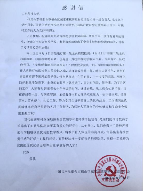 近日,williamhill英国威廉希尔收到中共烟台市福山区臧家庄镇寨里村支部委员会的感谢信,了解到威廉希尔官网土木工程2019级2班学生张璇在暑假期间主动站到了抗“疫”前线,在烟台市福山区臧家庄镇寨里村一线参与全员核酸检测工作。