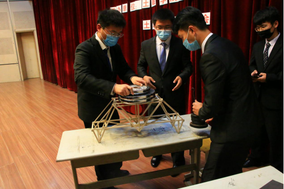 所有作品展示完成后,林跃忠副教授对本次大赛进行了点评,点明了结构设计最重要的是达成目的,在达成目的的基础上要追求美观,建议选手们要充分考虑设计的实用性和经济性。最后,王来教授对本次大赛作总结发言,指出本次大赛的目的就是培养学生的创新思维,希望同学们提高对专业的兴趣,并告诉同学们兴趣、知识、思考、坚持和执着加在一起就一定能够成功。