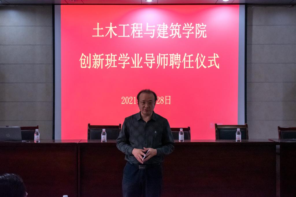 仪式开始,院长王崇革向全体参会导师和学生介绍了实验创新班的基本情况。他指出,实验创新班是为培养厚基础、宽口径、强能力、重创新的高水平拔尖人才而建设的实验创新试点项目,是学院全面贯彻党的教育方针,坚持立德树人根本任务的一项重要举措。同时,王院长向全体学生提出四点要求:一要志存高远,胸怀大志;二要勤奋学习,热爱专业;三要德智体美劳全面发展;四要时刻准备好迎接挑战。