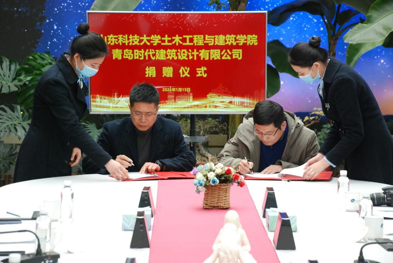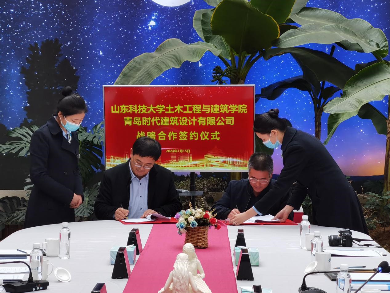 宋西路和于海鹏共同为“williamhill官方网站大学生就业创业实践基地”“williamhill官方网站教学实践基地”揭牌,并代表双方签署《校企合作协议》《BIM合作协议》等4份协议。薛力、青岛时代建筑设计有限公司综合办主任沈新宇代表双方签署《奖学金捐赠协议》等2份协议。