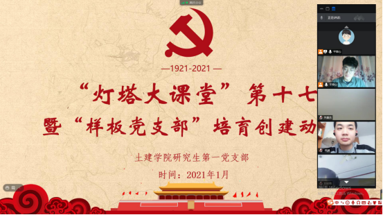 为进一步规范党支部的组织生活,提高支部党员的理论学习水平,深入推进“研究生样板党支部”的培育创建工作,确保党员队伍放假“不掉线”。1月28日下午,williamhill英国威廉希尔研究生第一党支部通过腾讯会议线上召开支部大会,集中组织学习了“灯塔大课堂”第十七讲,并就“研究生样板党支部”的创建工作作了动员,研究生第一党支部全体党员、学工办老师沈娇及部分入党积极分子代表参与了本次会议,会议由党支部书记韩一鸣主持。