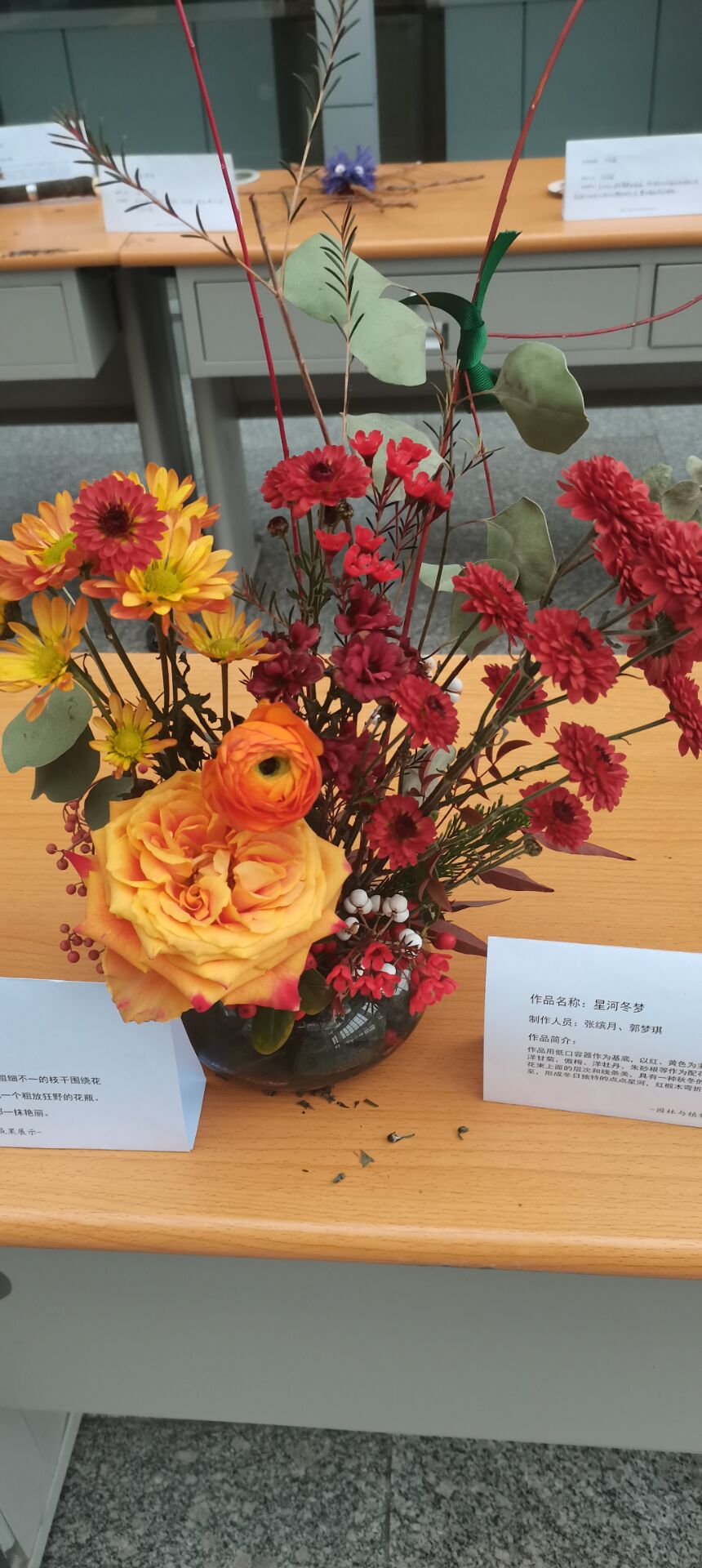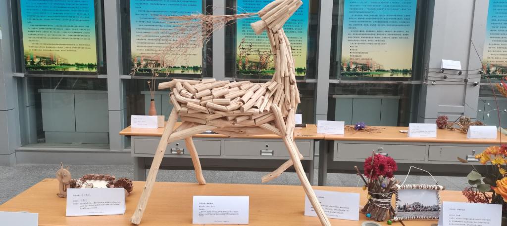 该展览旨在提高同学们的创新意识,激发同学们学习的积极性,提升专业素养,培养发现美、展现美的能力。展览过程中,同学们将原本“丑”“杂乱无章”的枯木经过一番加工,变成了精美的“花瓶”“梅花鹿”……作品设计手法清新自然,植物配置精心制作,体现了枯木中富有生机的自然美感,展现出了一幅幅别具一格的画面。