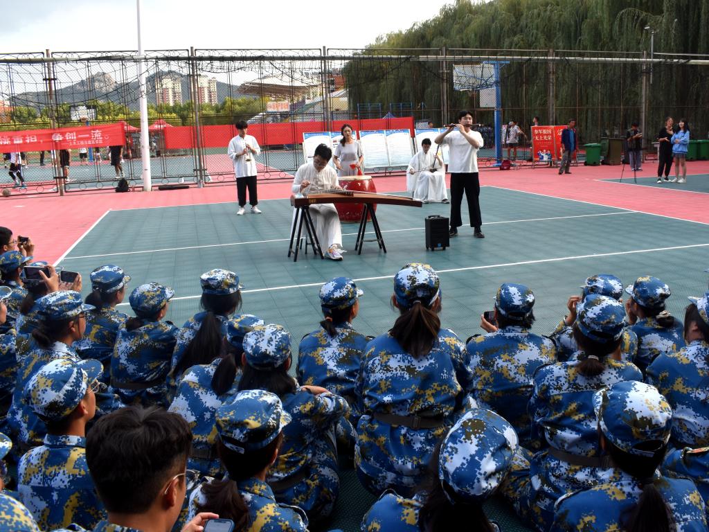 快闪现场,学生们以古筝、竹笛、二胡、中国鼓四种极具中国特色的传统乐器演奏出《九州同》,古风韵韵,指尖萦绕。不同的乐器有着不同的曲调,抑或舒缓悠扬,抑或激动起伏,吸引了新生们的注意力,点燃了全场的热情。