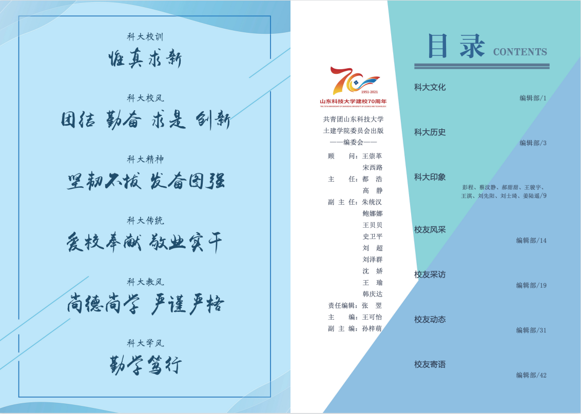 《建设者》校庆特刊由williamhill英国威廉希尔党委指导,学院新闻宣传中心编撰,包含“科大文化”“科大历史”“科大印象”“校友风采”“校友采访”“校友动态”“校友寄语”等七个板块,从不同视角呈现了科大之底蕴、土建之传承,帮助更多校友了解科大发展脉络、土建成长历程。本次校庆专刊特邀泰安、济南、济宁等校友会,以及多位优秀校友为山科送上生日祝福,充分展示了学院校友工作的成果和对科大真诚的祝愿。