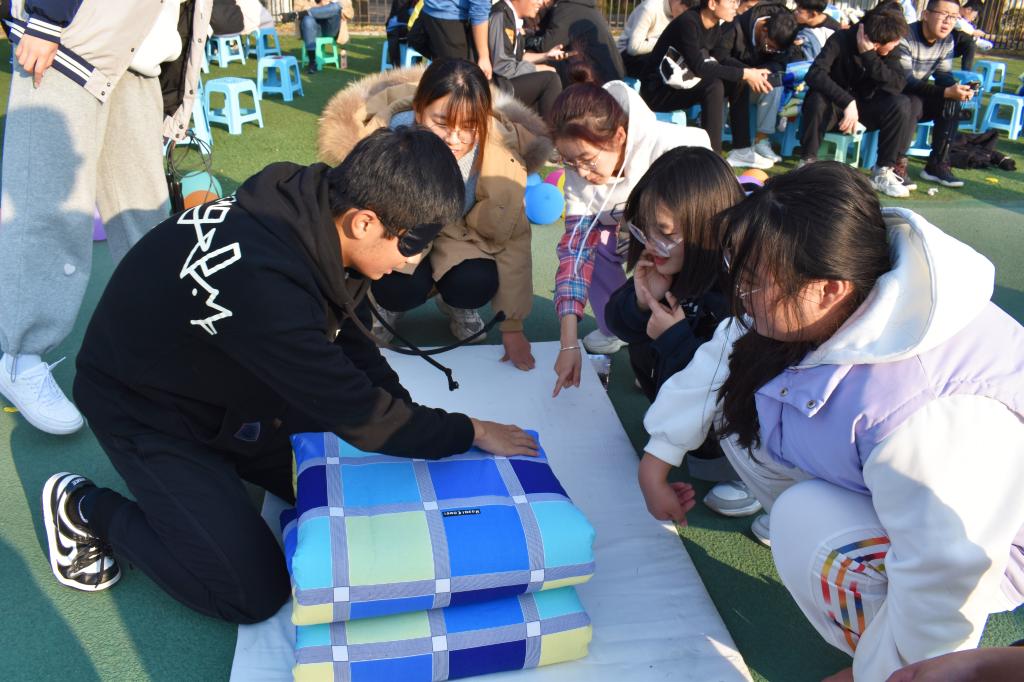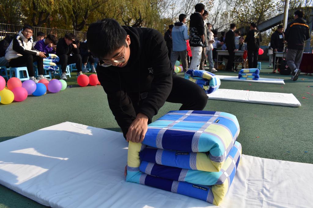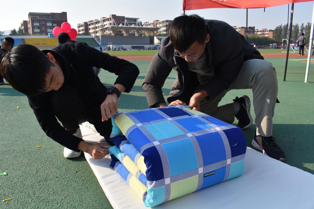 叠军被比赛是宿舍文化月活动的第一个比赛项目,此次叠军被比赛包括四个环节:气球大爆炸、占领阵地、叠叠不休、踩踩叠叠。为增加观众的参与感与积极度,比赛过程插入了中场游戏环节,亲友团参与游戏,游戏获奖者可为本队伍进行额度加分。随后,第三、四轮比赛依次进行,比赛仍以叠军被为中心,但在叠军被前增加了趣味环节,各个环节都极大的激发了同学们的积极性与参与感。每轮比赛结束评委进行一轮打分,最终名次以三次总分为标准,由各位嘉宾对获奖队伍进行颁奖。经过三轮激烈比拼,获得一等奖的是建筑学21-3班,获得二等奖的是土木类21-5班、建筑学21-1班,获得三等奖的是土木类21-6班、土木类21-11班、土木类21-7班。