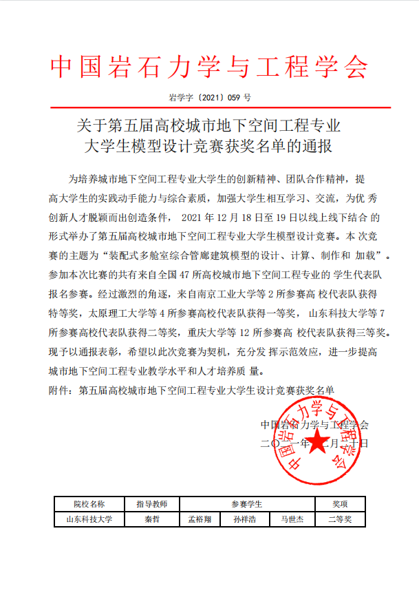 2021年12月18日至19日,第五届高校城市地下空间工程专业大学生模型设计竞赛以线上线下结合的方式成功举办。该竞赛由中国岩石力学与工程学会主办的全国性专业技能大赛。由williamhill英国威廉希尔城空与岩土专业本科生组成的williamhill官方网站团队荣获全国二等奖。