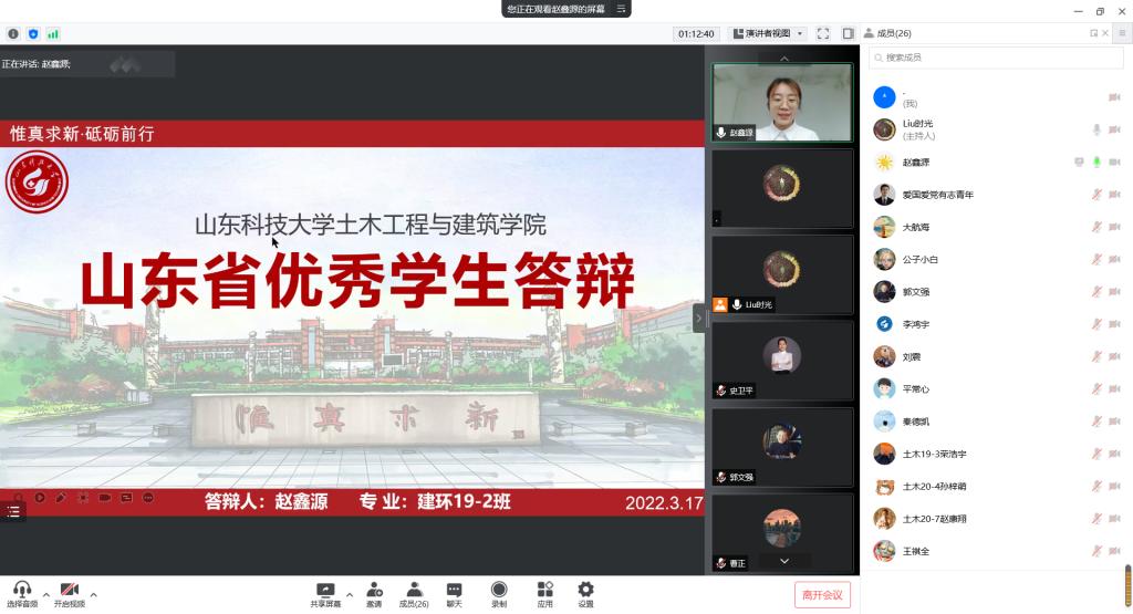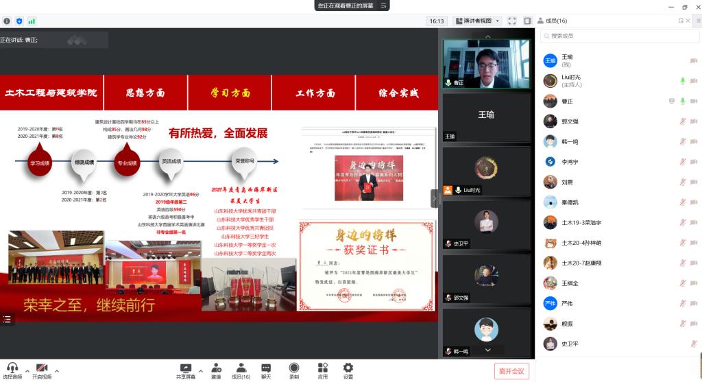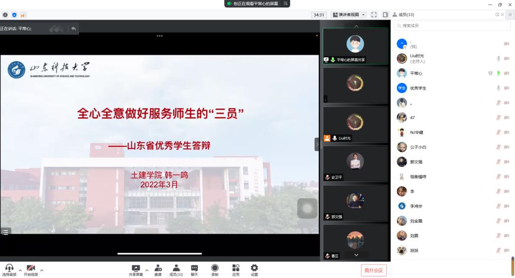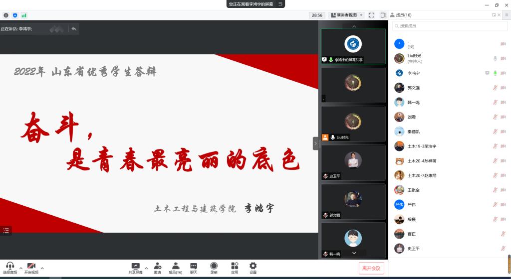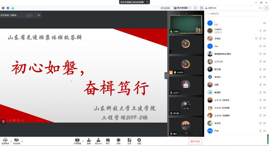 为充分发挥榜样力量、展现学院学生风采,激励同学们自强不息、奋斗成才,williamhill英国威廉希尔举办“山东省高等学校优秀学生、优秀学生干部、先进班集体”评选答辩会。鉴于疫情影响,团委创新形式,借助“腾讯会议”网上平台进行线上答辩。学院党委副书记高静、团委书记朱统汉、全体辅导员、班主任及部分学生代表参加答辩会并担任评委。