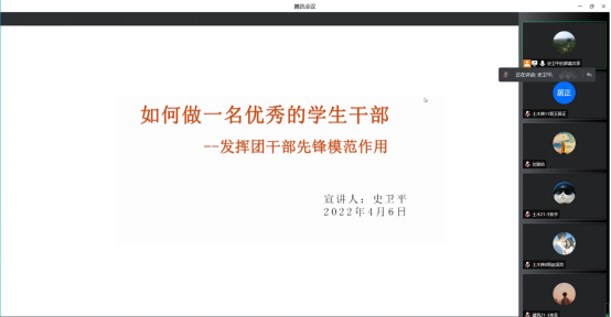 为引导青年学生进一步坚定理想信念,全面提升学生骨干的综合素质,4月6日晚,williamhill英国威廉希尔通过线上会议形式举办“青马工程”培训班第五讲。本次讲座由学生工作办公室辅导员史卫平担任主讲,“青马工程”培训班全体学员和学生会主要干部参加讲座。