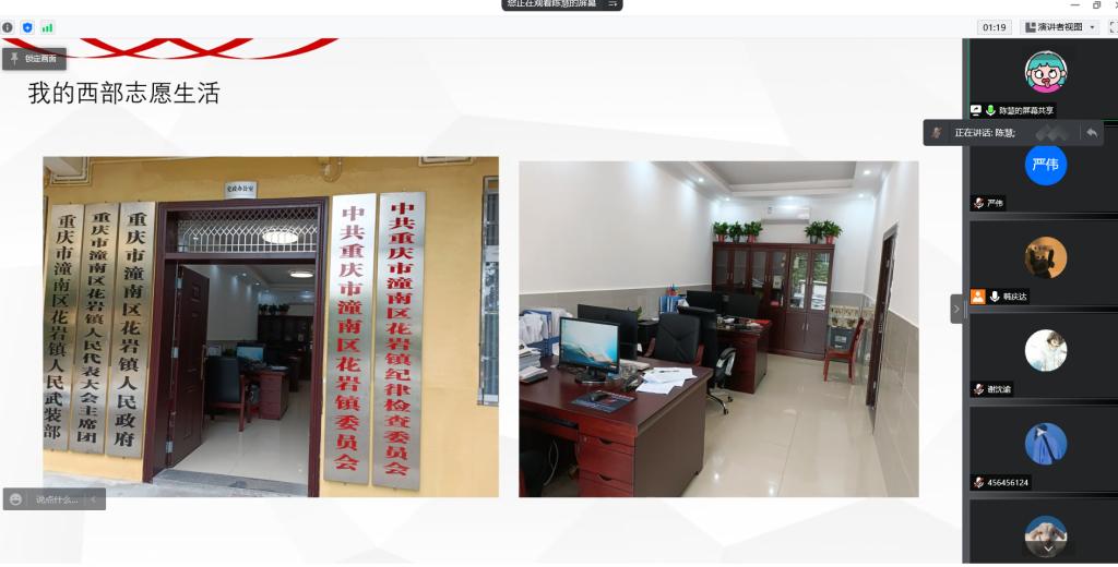 为进一步做好西部计划的宣传动员、招募选拔工作,弘扬志愿精神,转变学生的择业就业观念,引导大学毕业生到西部、到基层、到祖国最需要的地方建功立业。4月18日,williamhill英国威廉希尔于J15-219会议室举办“志愿西行 追梦青春”西部计划宣讲活动。本次宣讲会邀请到2020届新疆西部计划志愿者孙真真和2021届重庆西部计划志愿者陈慧担任主讲,会议由团委书记朱统汉主持,本科和硕研有意向参与西部计划志愿的学生参会。