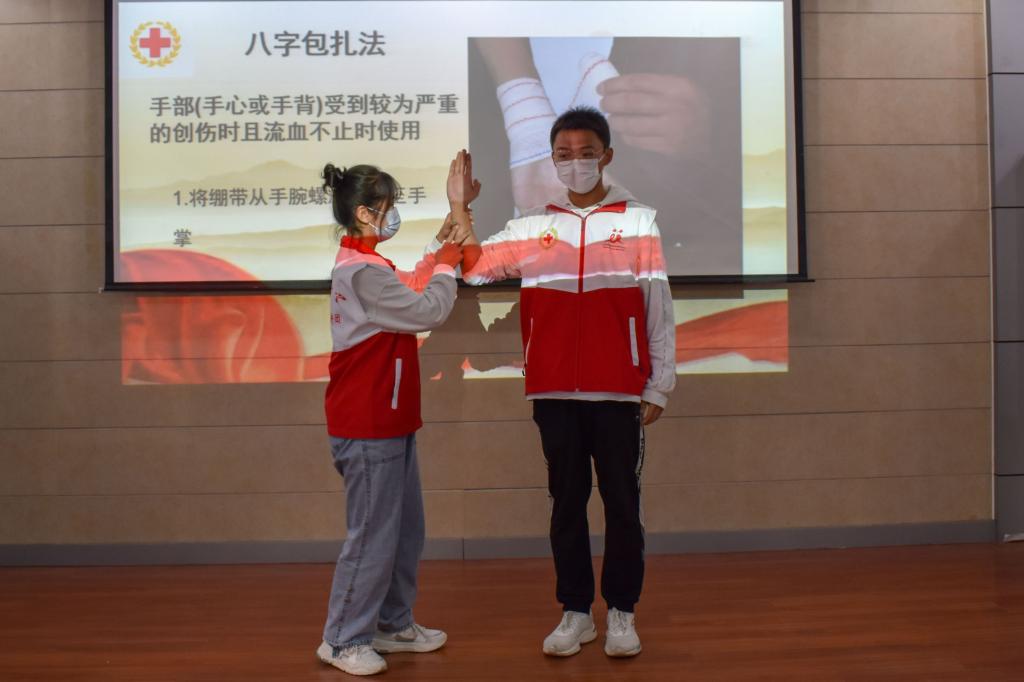 活动伊始,校红十字宣讲人员介绍此次宣讲的主要内容,流程包括血压测量、包扎止血、常见意外应对措施、建筑施工行业五大伤害以及心肺复苏五大部分。在讲解到包扎止血时,宣讲人员给同学们分发了三角巾和绷带,分别介绍并实操了肩部、胸部、头部、八字包扎和止血带止血法。