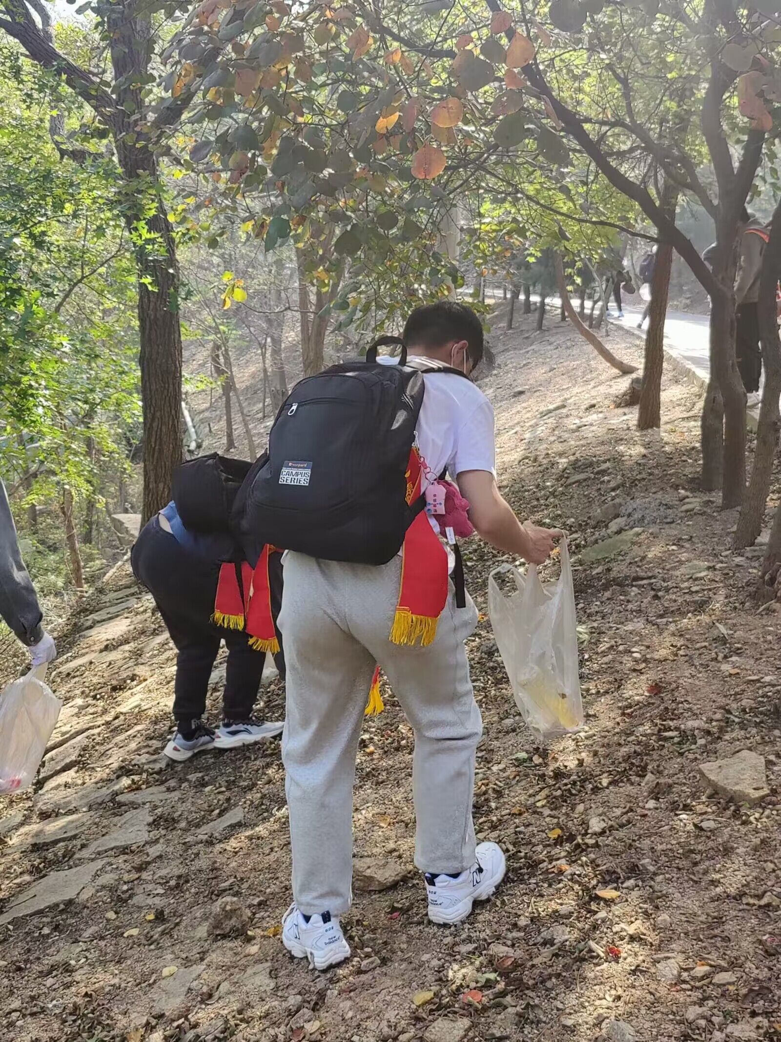 上午九点,志愿者们集结小珠山并迅速分组开展对景区的环保清洁工作。志愿者们深入丛林,捡起游客留下的果皮纸屑、矿泉水瓶、包装纸袋等各种垃圾。“知者行之始,行者知之成”,此次活动不只是一次简单劳动,更是一次将环保呈于大众的生动实践。环保之路在脚下,环保之情在心中。志愿者们以自己的实际行动传播了环保理念,在温暖的阳光下挥洒汗水,将自己的奉献之心埋藏于这片温柔的土地里。