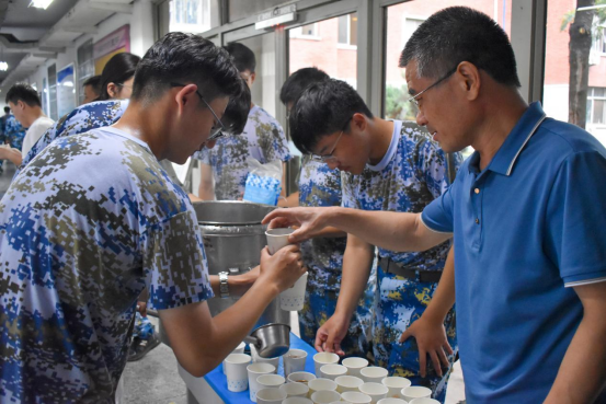在各班级负责人的组织下,学院2023级新生们有序排队前往宿舍楼下领取姜茶,学院党委书记宋西路、党委副书记高静、学生工作办公室辅导员们将温热的姜茶递给同学们。宋西路勉励新生们要发扬吃苦耐劳精神,为自己未来四年的学习生涯系好第一粒扣子,把军训中的优秀品质延续到日后的学习和生活中去。有一位同学接过姜茶时说:“感谢学院领导和老师们的暖心关怀,能够来到山科、来到williamhill英国威廉希尔真是既幸运又幸福。”